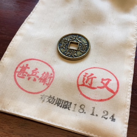 と、そば巡り巾着を渡し永楽通宝1枚使用
