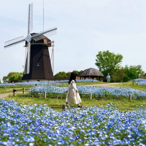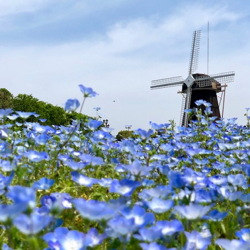 太陽の下 風車とネモフィラの中の天使ちゃん