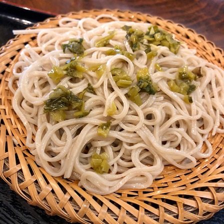 わさびの葉?茎がのった「アルプスわさびそば」でと