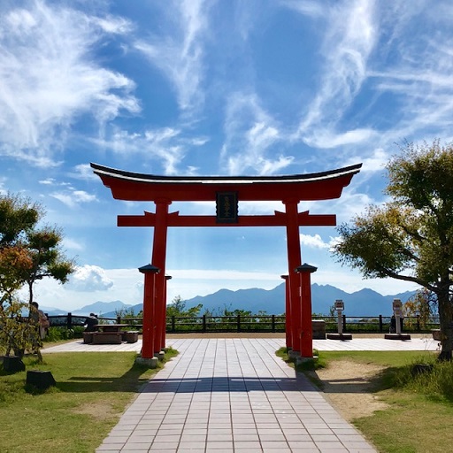 青い空に映える朱色の鳥居がある、宮島SAで