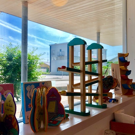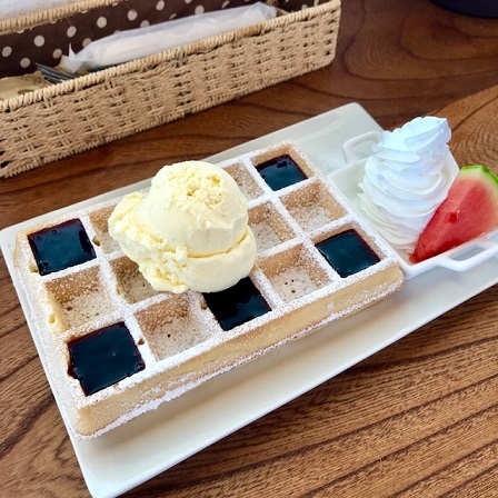 カフェスペースに運ばれる、ワッフルを自然と目で