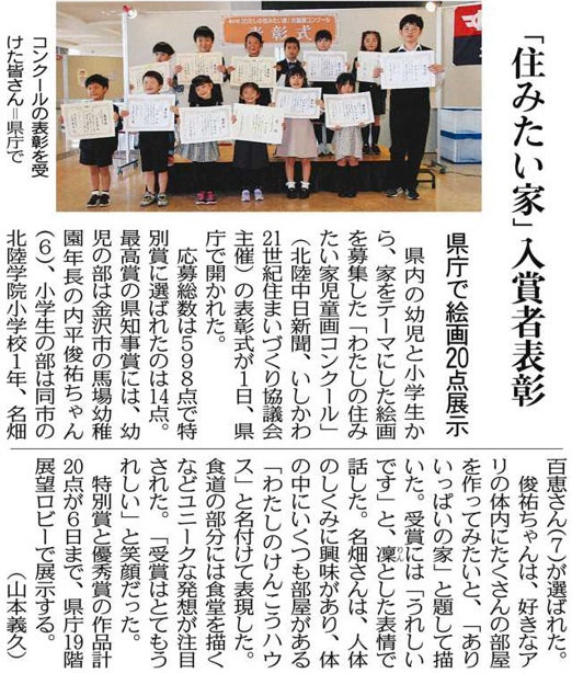 国土交通省が提唱する「10月は住生活月間」の協賛事業として、住まいへの関心を高め夢をはぐくむことを目的とした児童画コンクール。 石川県内の幼児と小学生から、家をテーマにした絵画を募集した「わたしの住みたい家児童画コンクール」の表彰式が11月1日、県庁でありました。 |