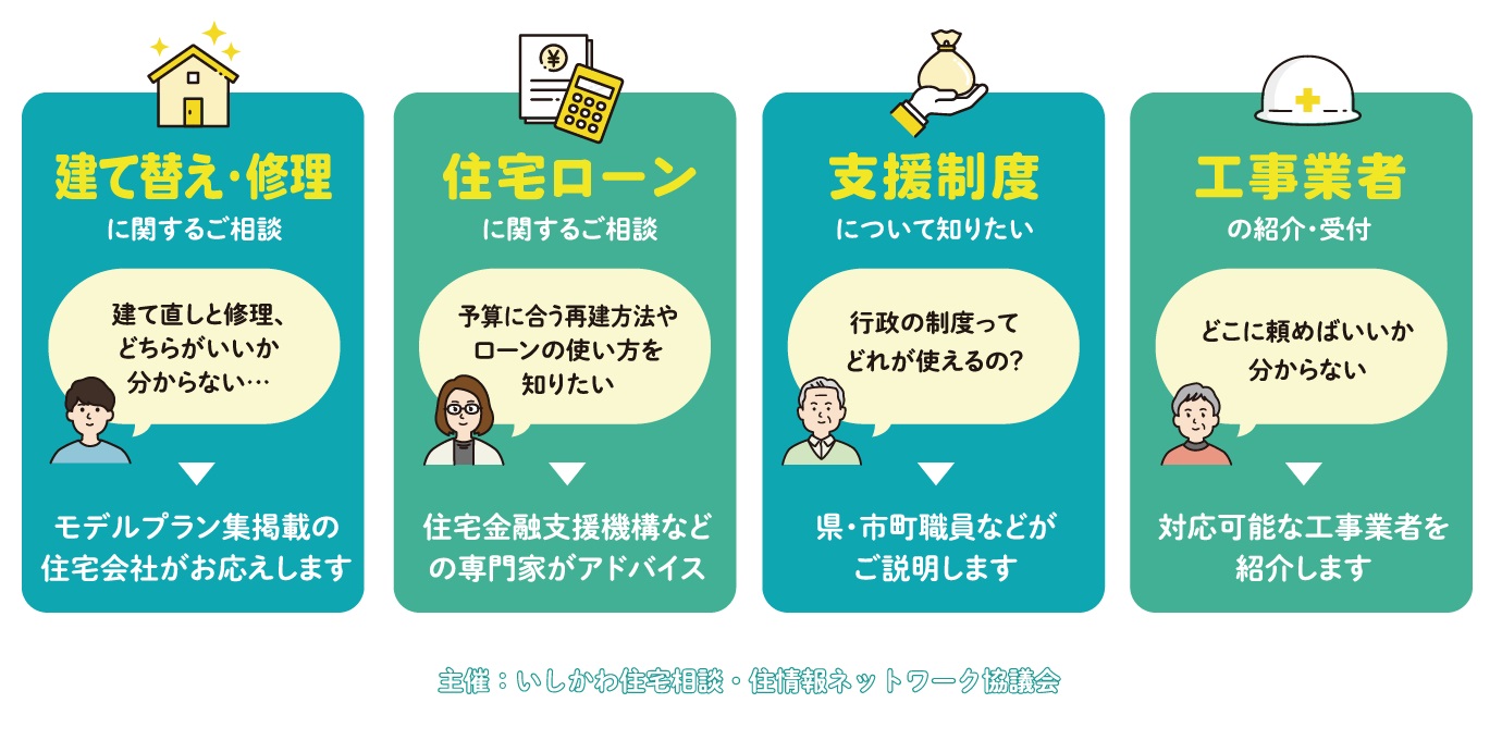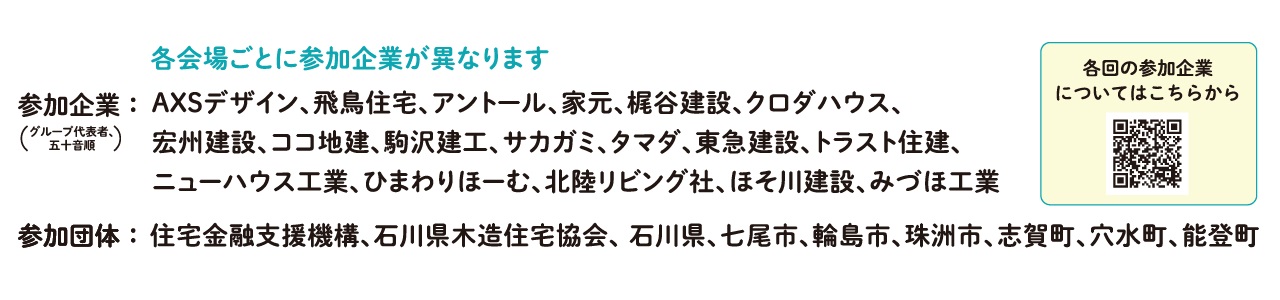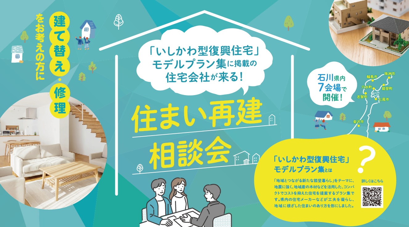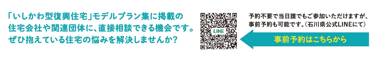 ホーム イベント報告 住まい再建 相談会 ◆終了しました 住まい再建 相談会 日時:9月20日㊏ 10:00~15:00場所:石川県庁19階展望ロビー 「いしかわ型復興住宅」モデルプラン集に掲載の住宅会社や関係団体に、直接相談できる機会です。ぜひ抱えている住宅の悩みを解決しませんか?お申し込み 「いしかわ型復興住宅」モデルプラン集(外部リンク) ※LINEアプリのカメラでQRコードを読み込むか、LINEアプリ内でURLにアクセスしてください。 各回の参加企業(外部リンク)