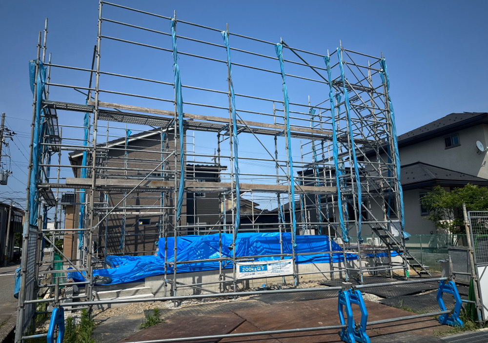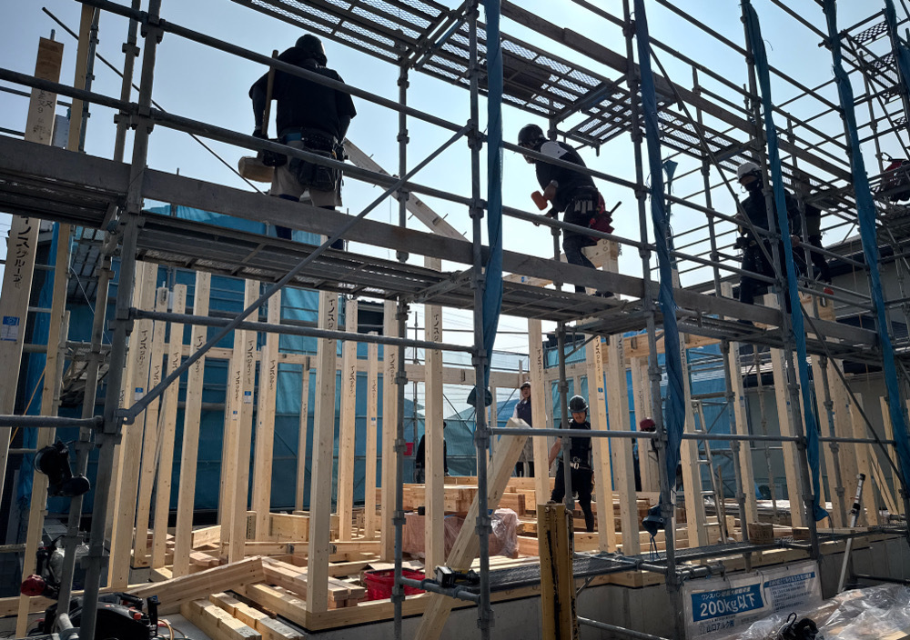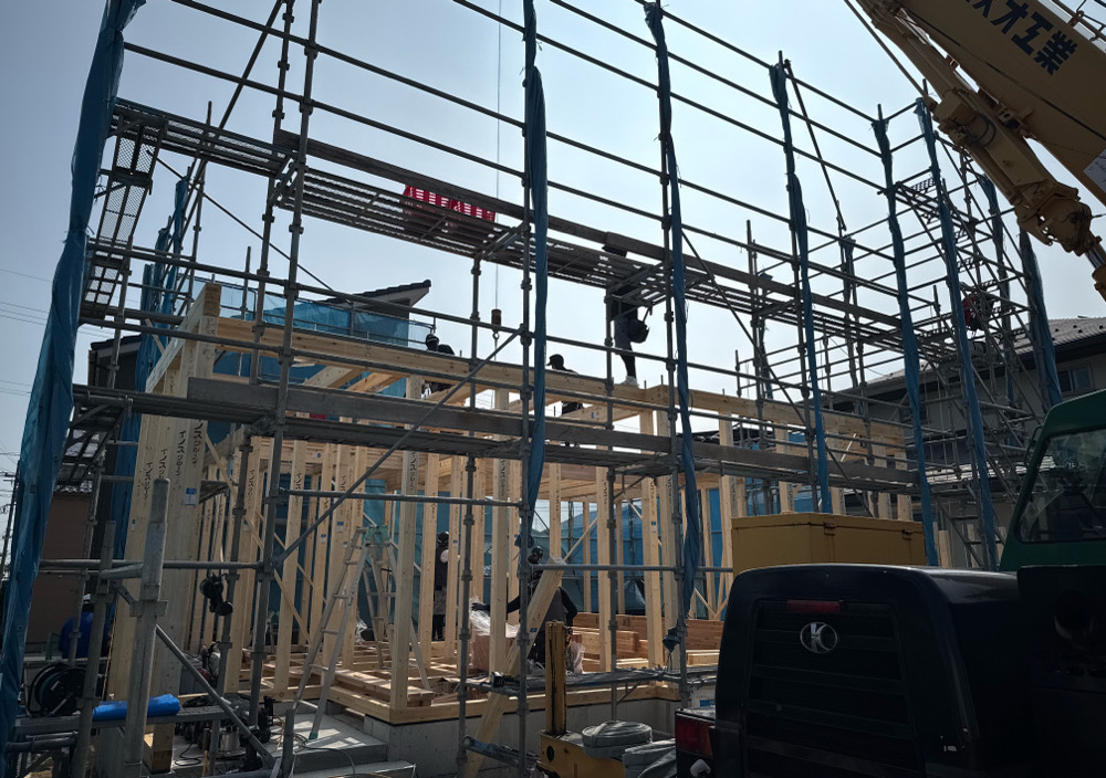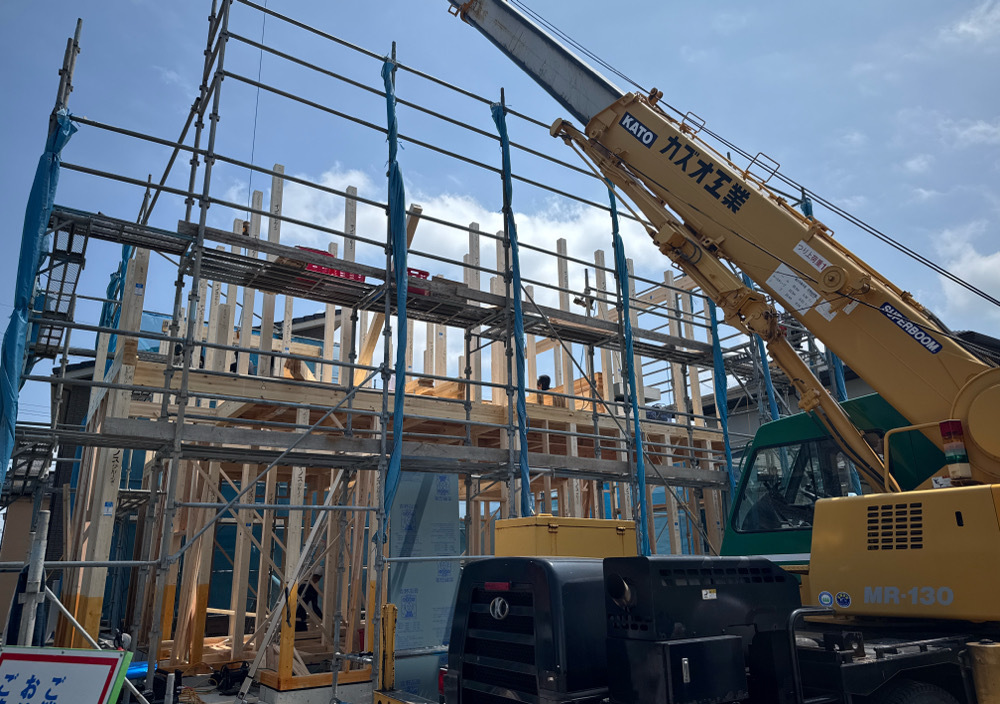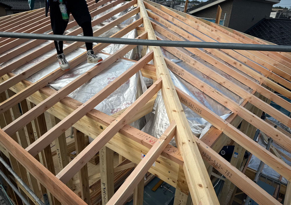 午前12時ごろ、小屋束を立て母屋を組んでいきます。